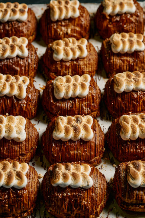 A pain au chocolat filled with marie biscuit grangipane, dark chocolate batons, and marshmallow. Finished with melted chocolate, torched vanilla meringue, and biscuit crumb.